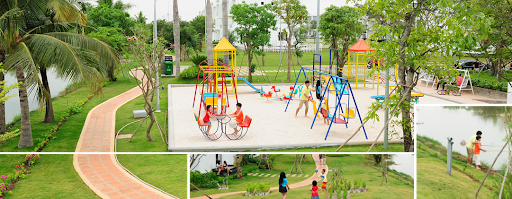 Thiết bị: Cầu trượt (phù hợp chiều cao), nhà leo dây, bập bênh, xích đu (loại có ghế ngồi an toàn).