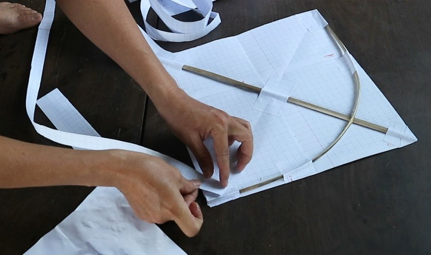Bước 10: Sử dụng dây chỉ, dây cước hay dây thùng carton luồn vào đầu trên và đầu dưới của con diều và hoàn thiện.