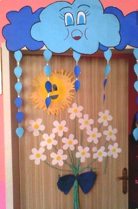 Một trong những cách trang trí cửa lớp mầm non hiệu quả đó là sử dụng hình ảnh cắt dán. Bạn có rất nhiều lựa chọn như cắt ông mặt trời, hoa, động vật, đám mây…
