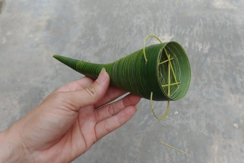 Sau khi chiếc kèn đã đủ to, mẹ có thể cố định thân kèn bằng gân lá để các nếp không bị gãy.