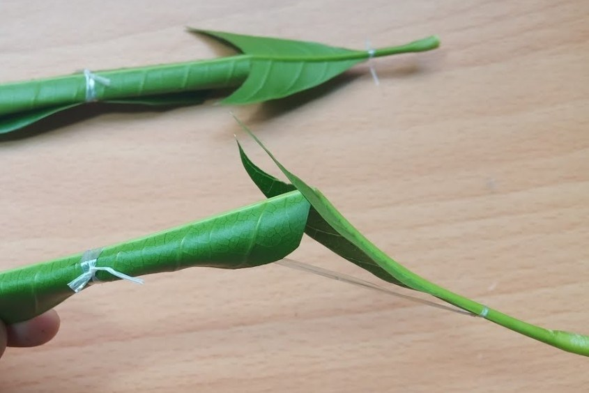 Cuộn hai bên lá lại và sử dụng chun cố định.