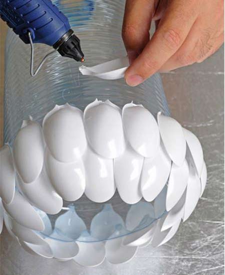 Bước 2: Gắn phần muỗng thìa lên bình bằng súng bắn keo. Gắn lần lượt xung quanh bình cho tới hết.