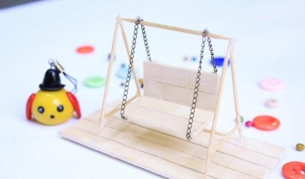 Bước 6 : Treo chiếc ghế lên khung ghế, dùng keo 502 dán chặt toàn bộ phần khung ghế vào phần đế. Vậy là món đồ chơi cho bé đã hoàn thành.