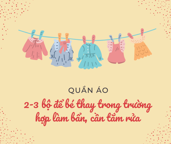 Hãy chuẩn bị thêm cho bé 2-3 bộ quần áo (theo mùa) để cô thay cho bé ở lớp. Bởi trẻ nhỏ đi học sớm thường chưa biết cách giữ gìn vệ sinh nên quần áo hay lấm bẩn khi ăn, khi chơi... Mẹ chú ý chuẩn bị cho bé những bộ quần áo thoải mái, chất liệu mềm mại, thông thoáng để khi vận động nhiều có thể thấm hút mồ hôi cho trẻ.