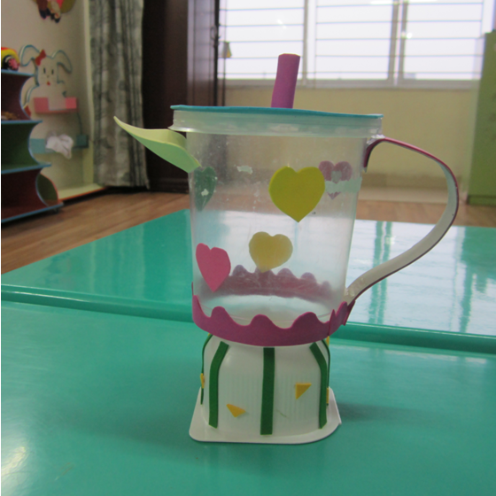 – Chất liệu: Được làm từ chiếc cốc nhựa màu trắng và một chiếc vỏ hộp sữa chua, xốp màu, keo dán.